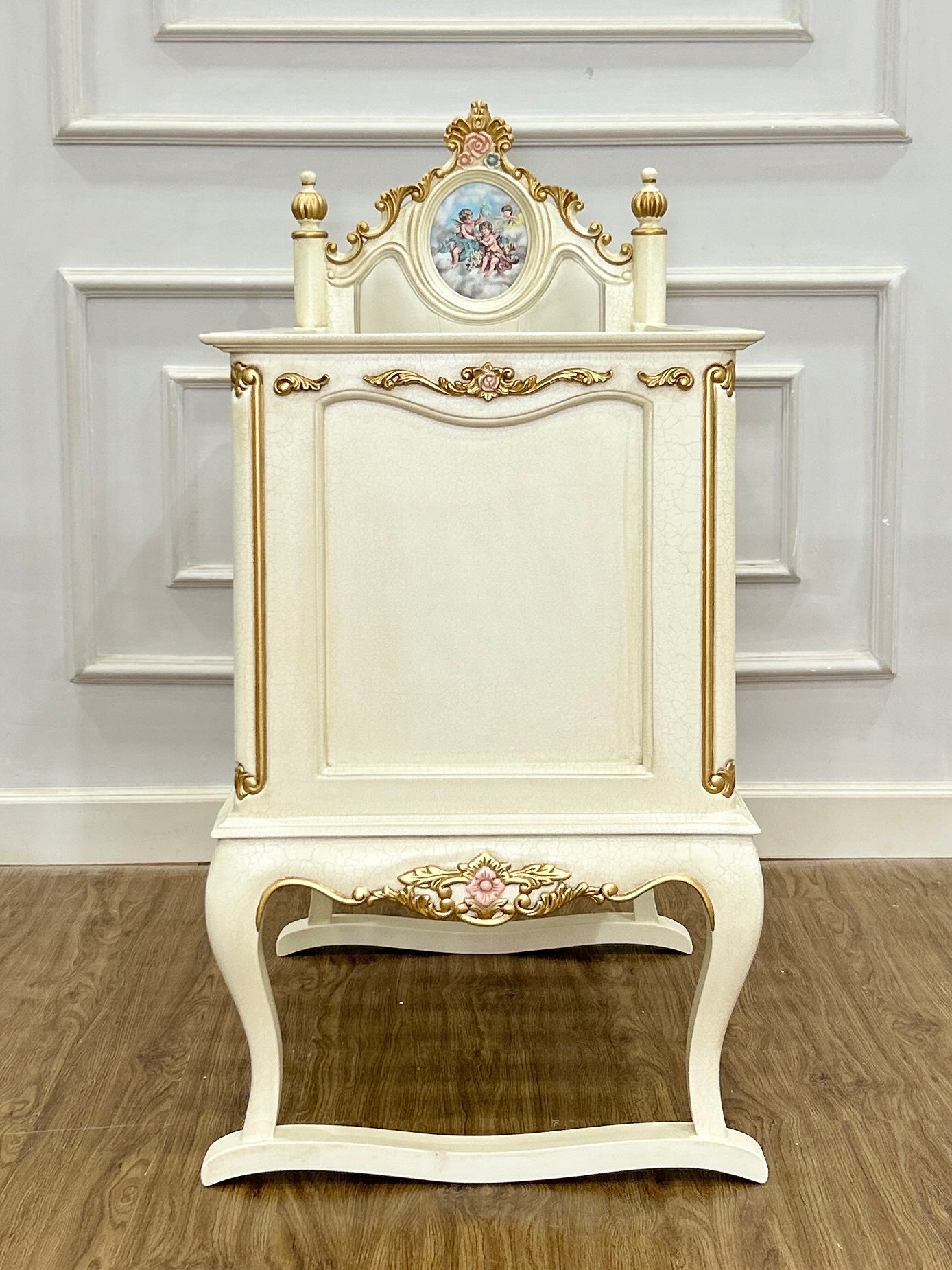 - Finish: Antique cream with pastel embellishments and soft crackle texture