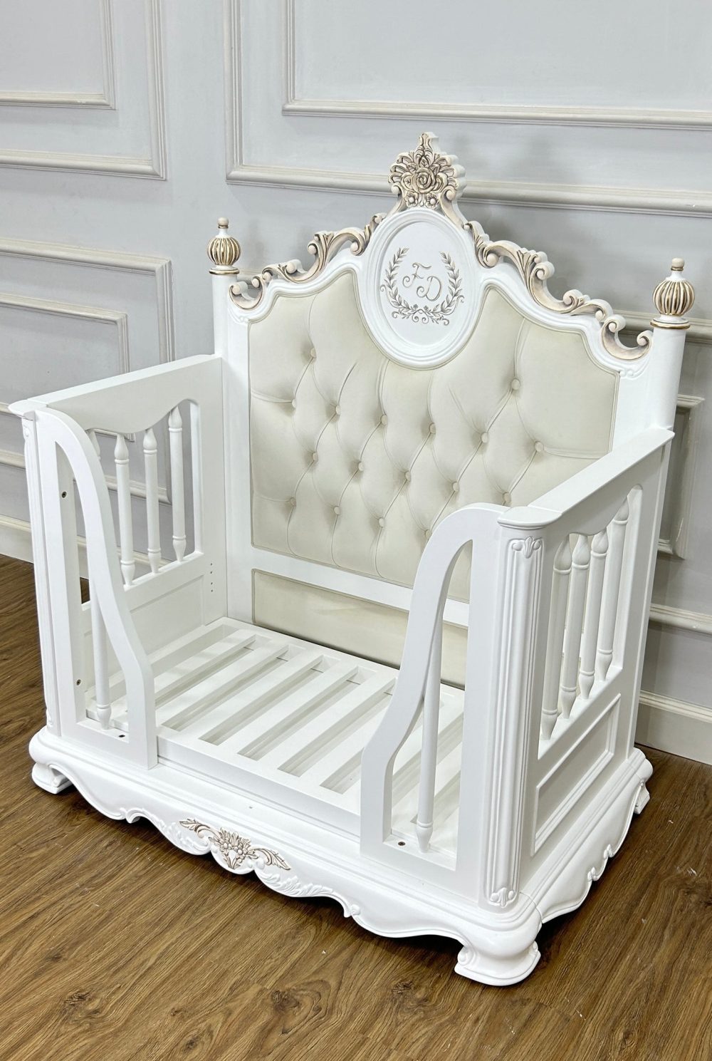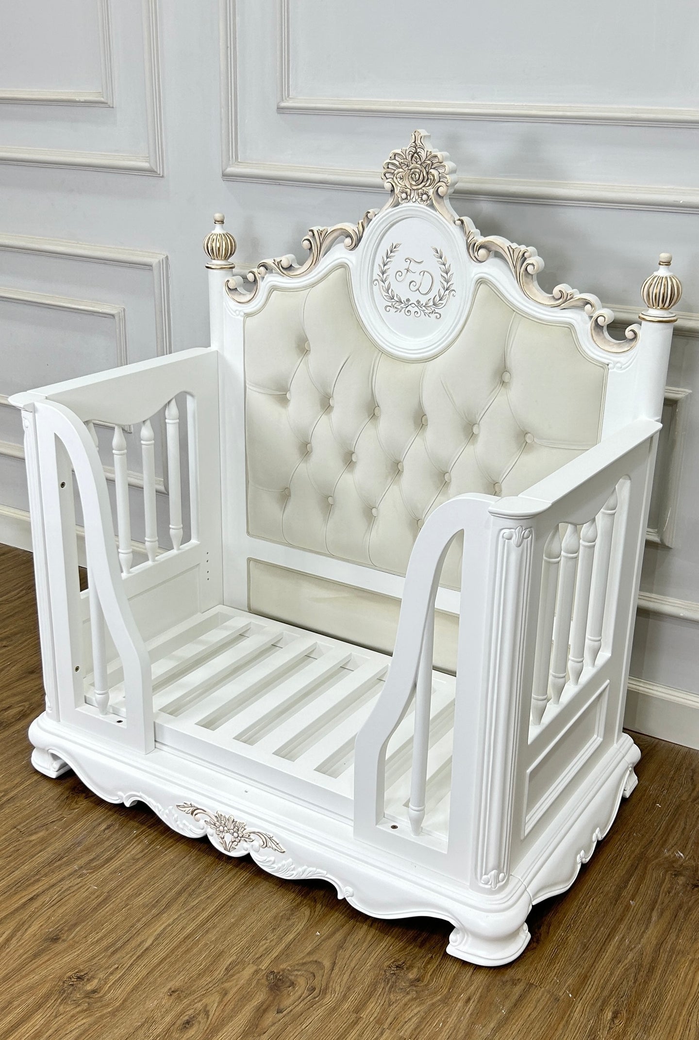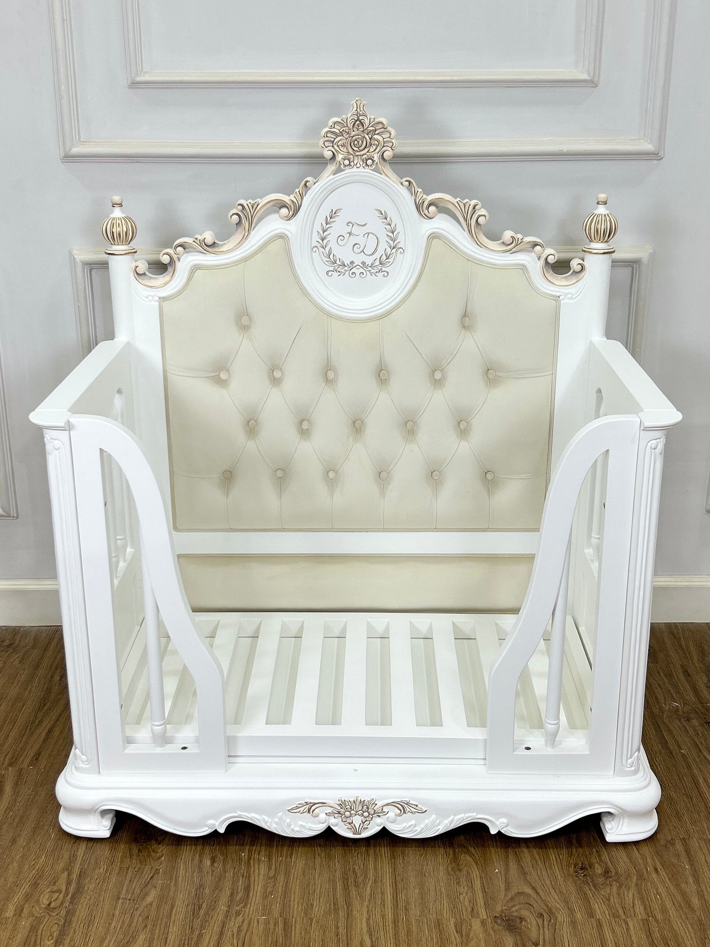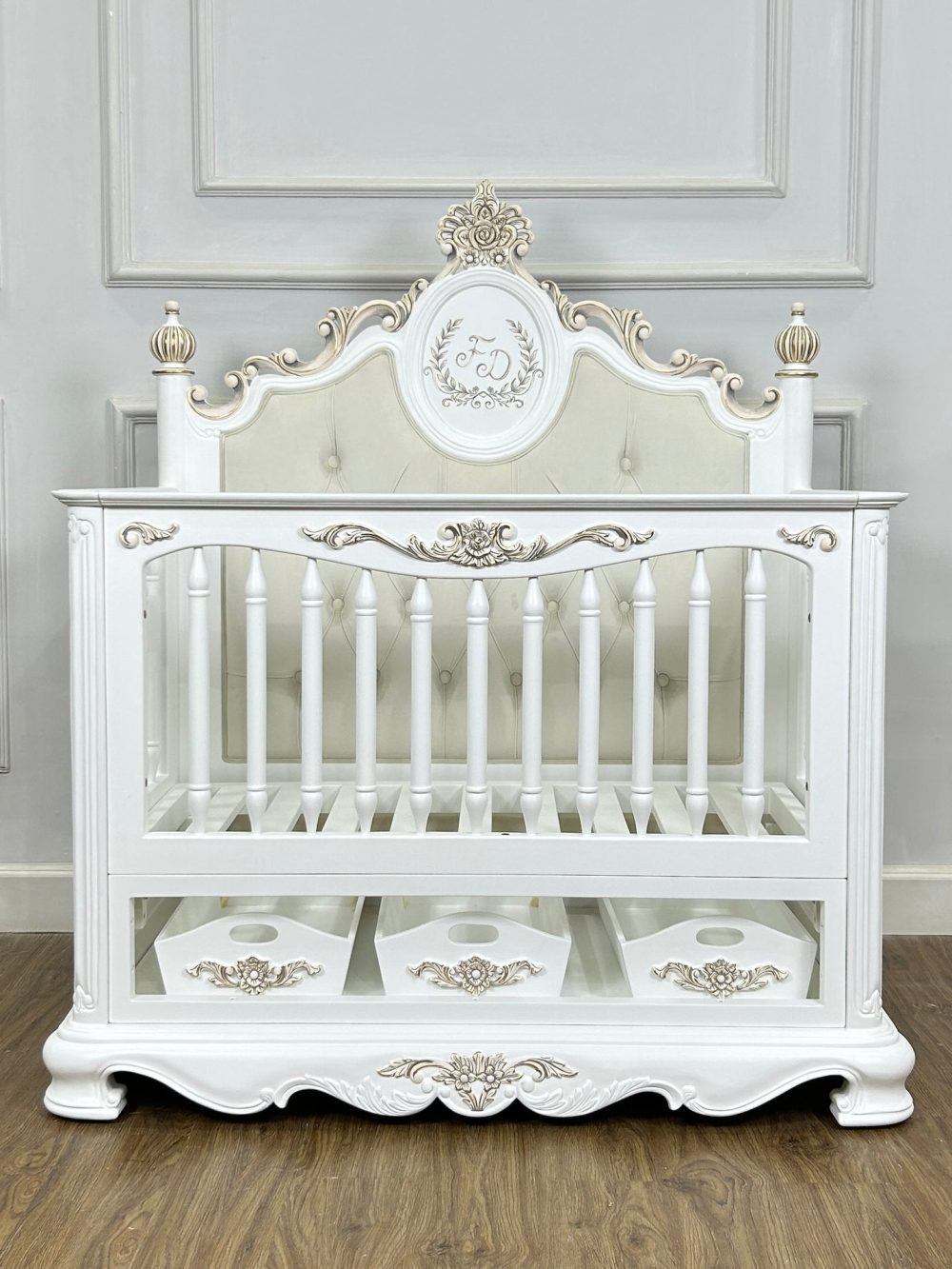 This version boasts an oval personalised panel on the headboard and elegant rose carvings in durable mahogany. It has three removable storage drawers, adapting the cot as your child grows.