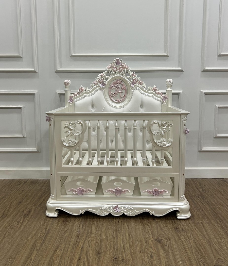 The Oud Roses cot features rose detailing and an oval personalised panel within the headboard for the initials of your little one.